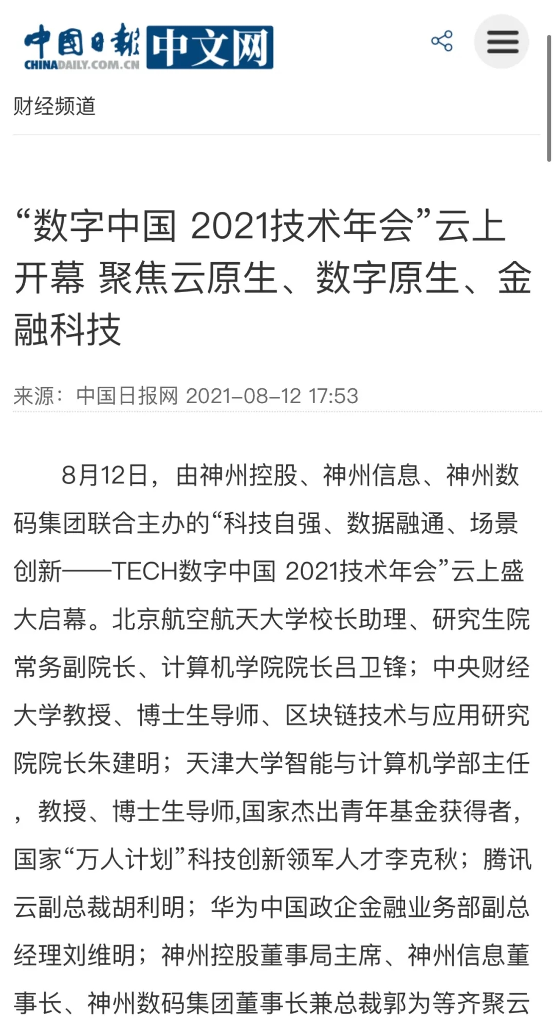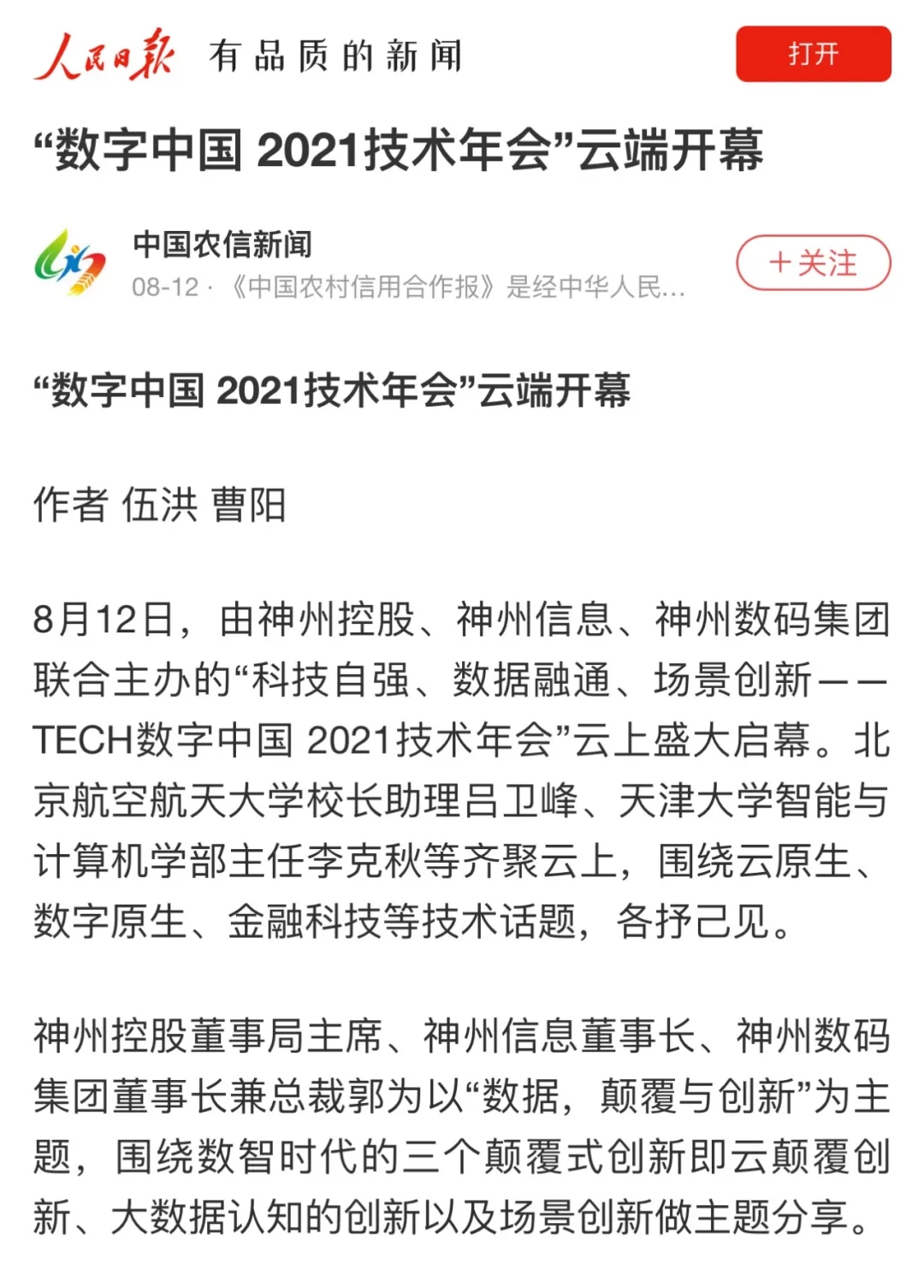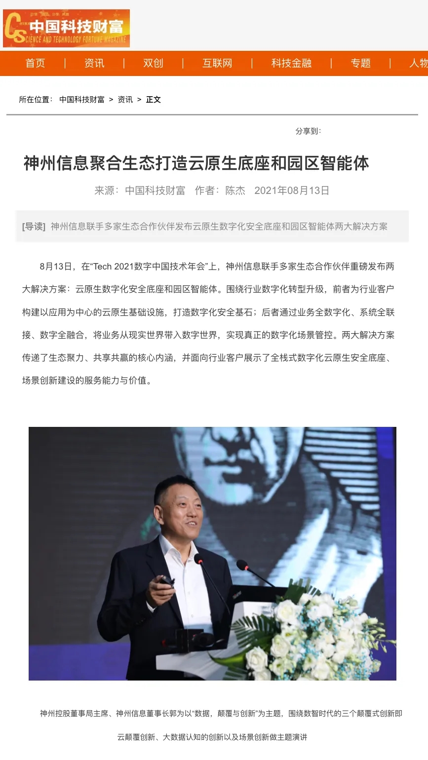 8月12日,由神州控股、神州信息、j9国际站集团联合主办的“科技自强、数据融通、场景创新——TECH数字中国 2021技术年会”云上盛大启幕,发布神州信创云、ModelB@nk5.0、金融超脑Sm@rtFSB、云原生数字化安全底座、园区智能体等重磅产品,国内各大权威、影响力媒体多角度多频次对盛况进行报道!